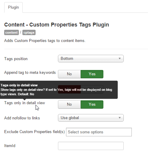 Edit: alternately you can set parameter 'Tags only in detail view' to Yes in 'Content - Custom Properties Tags Plugin'